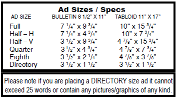 - Color ads are available for Full (+$75), Half (+$50), and Quarter (+$50) sizes only.